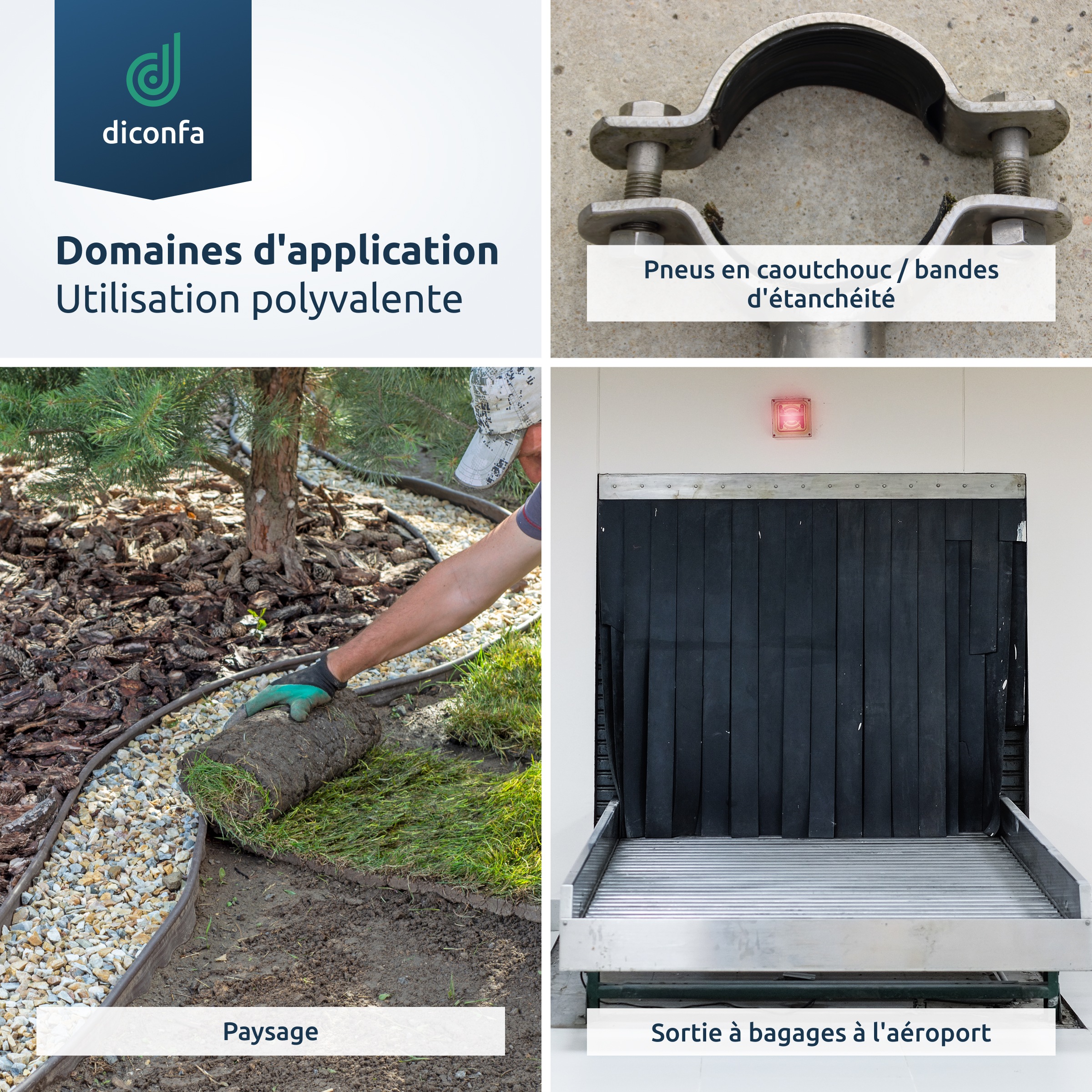 AUTRES PRODUITS : Les bandes en caoutchouc sont proposées par « diconfa – digital configuration factory » dans des largeurs de 8 mm à 1200 mm et des longueurs allant jusqu’à 10 m, disponibles également en version autocollante et dans d’autres matériaux (EPDM, NBR, etc.).