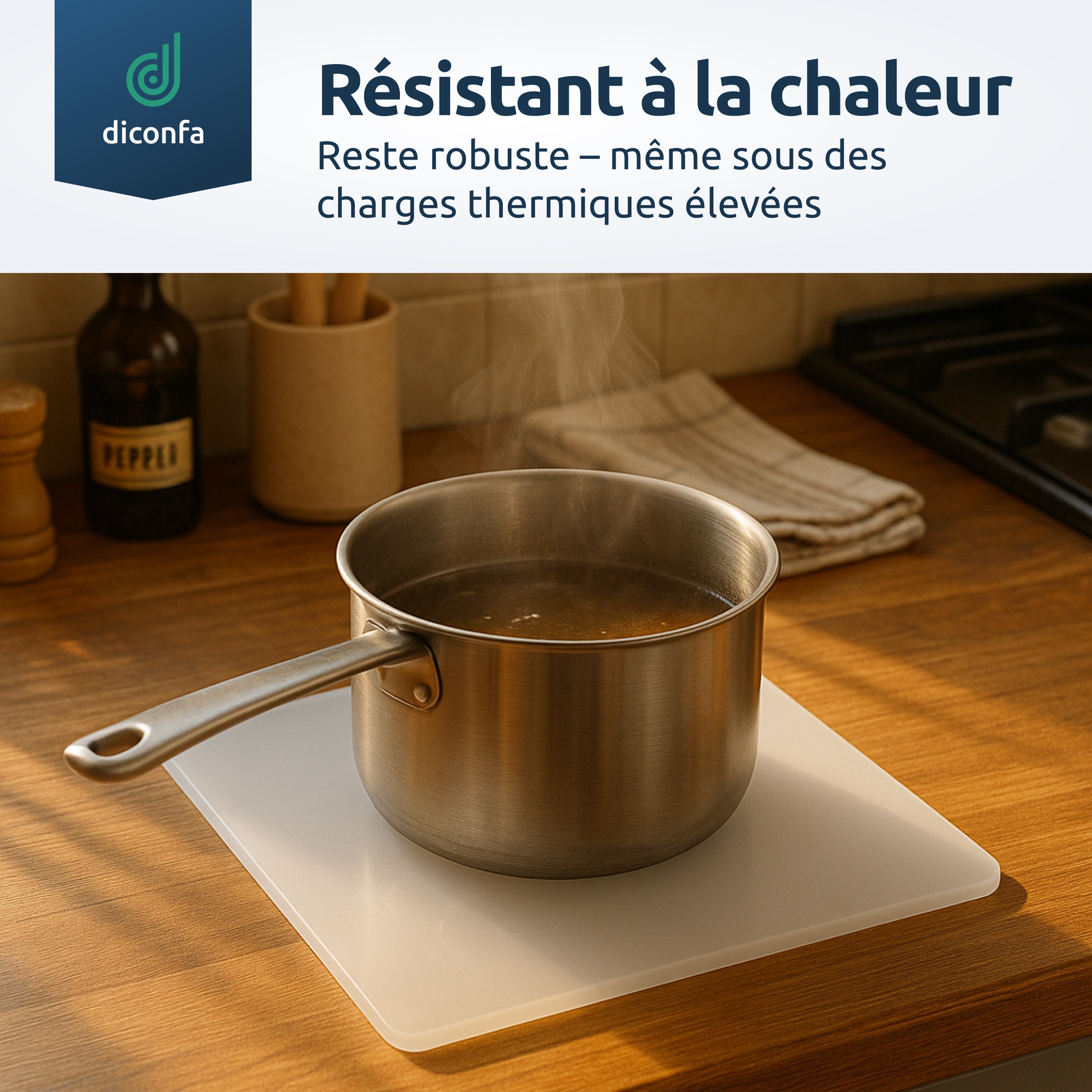 100 % QUALITÉ : Plaque en silicone translucide (laiton) – compatible alimentaire, conforme FDA, élastique, robuste, inodore et facile à nettoyer (eau & savon). Plage de température : -60 °C à +230 °C.