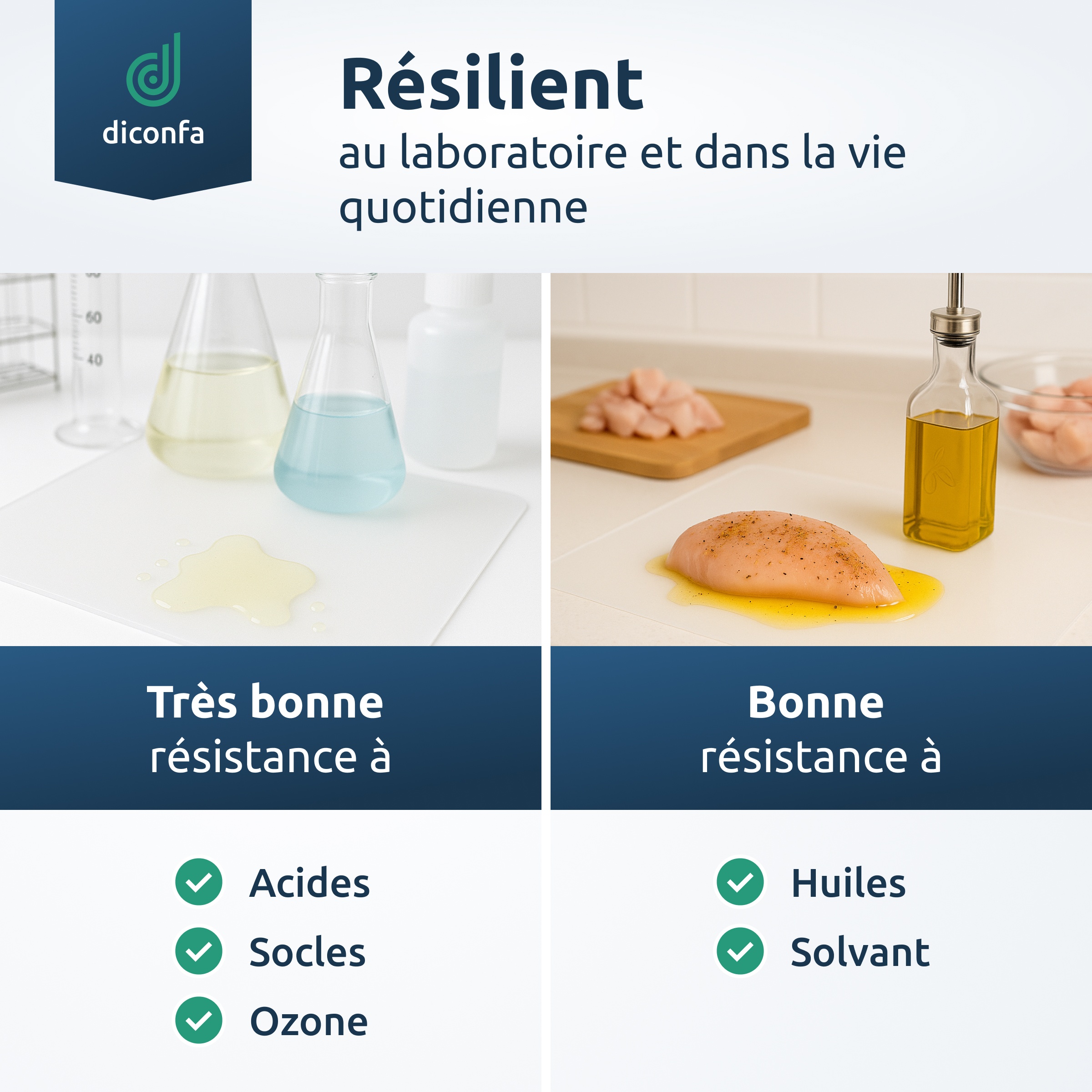 CARACTÉRISTIQUES : Résistance à la traction 10 MPa, allongement 350 %, dureté 60° Shore A. Très résistant aux acides, aux bases et à l’ozone, bonne résistance aux huiles et solvants.