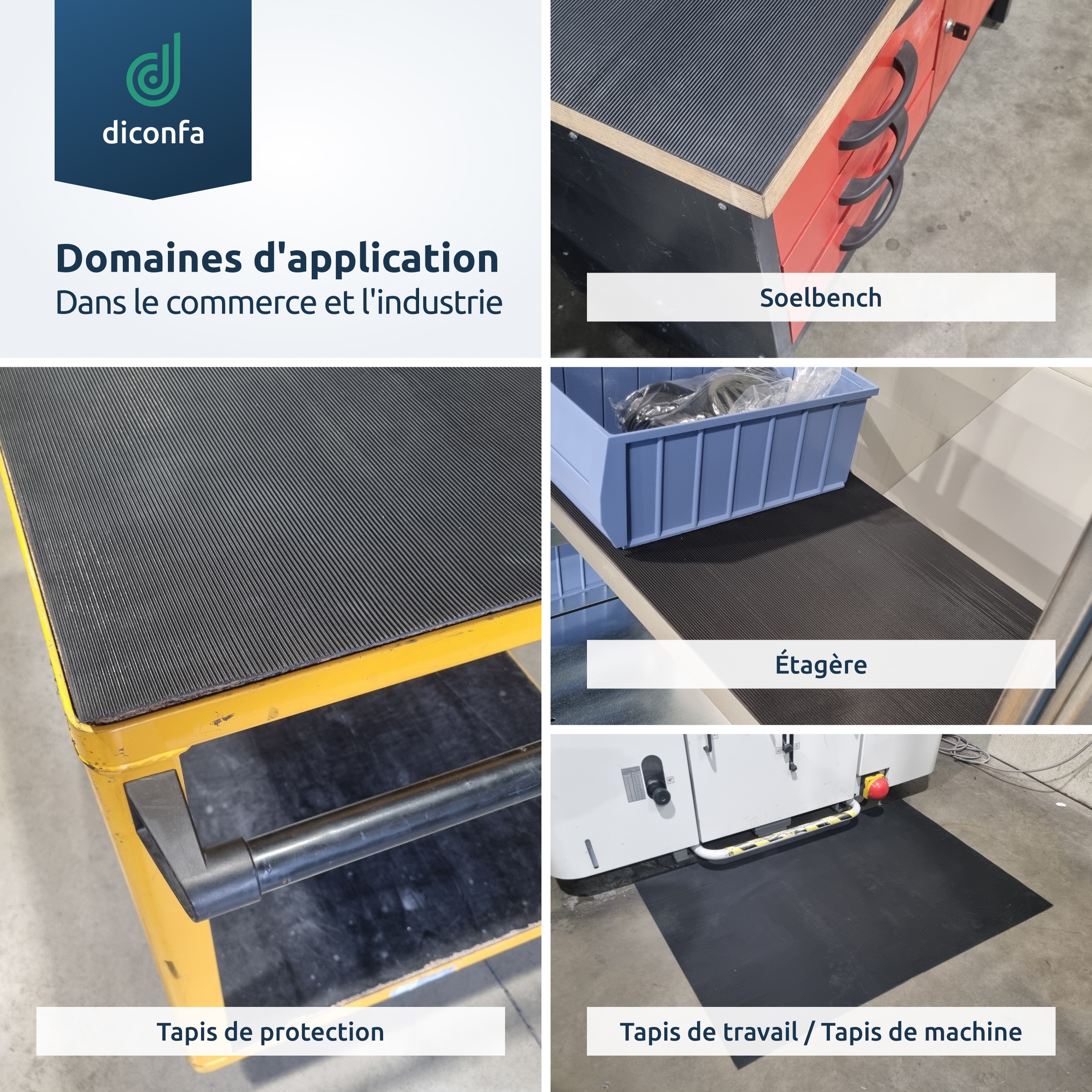 DOMAINES D’APPLICATION : Pour l’industrie, l’artisanat, la logistique ainsi que pour un usage privé. Convient aux remorques ou coffres de voiture, garages, ateliers ou établis, écuries, serres ou entrepôts, pour le camping ou sur les bateaux, comme revêtement de sol en caoutchouc, paillasson, garniture d’étagère, tapis de stockage, tapis de protection, tapis antidérapant, etc.