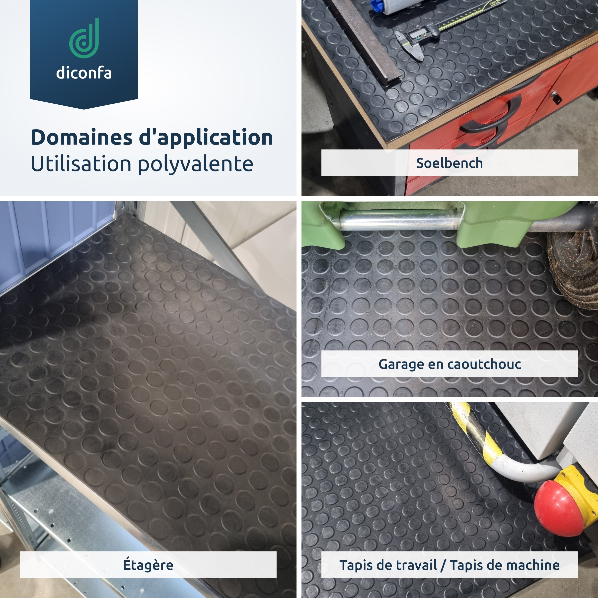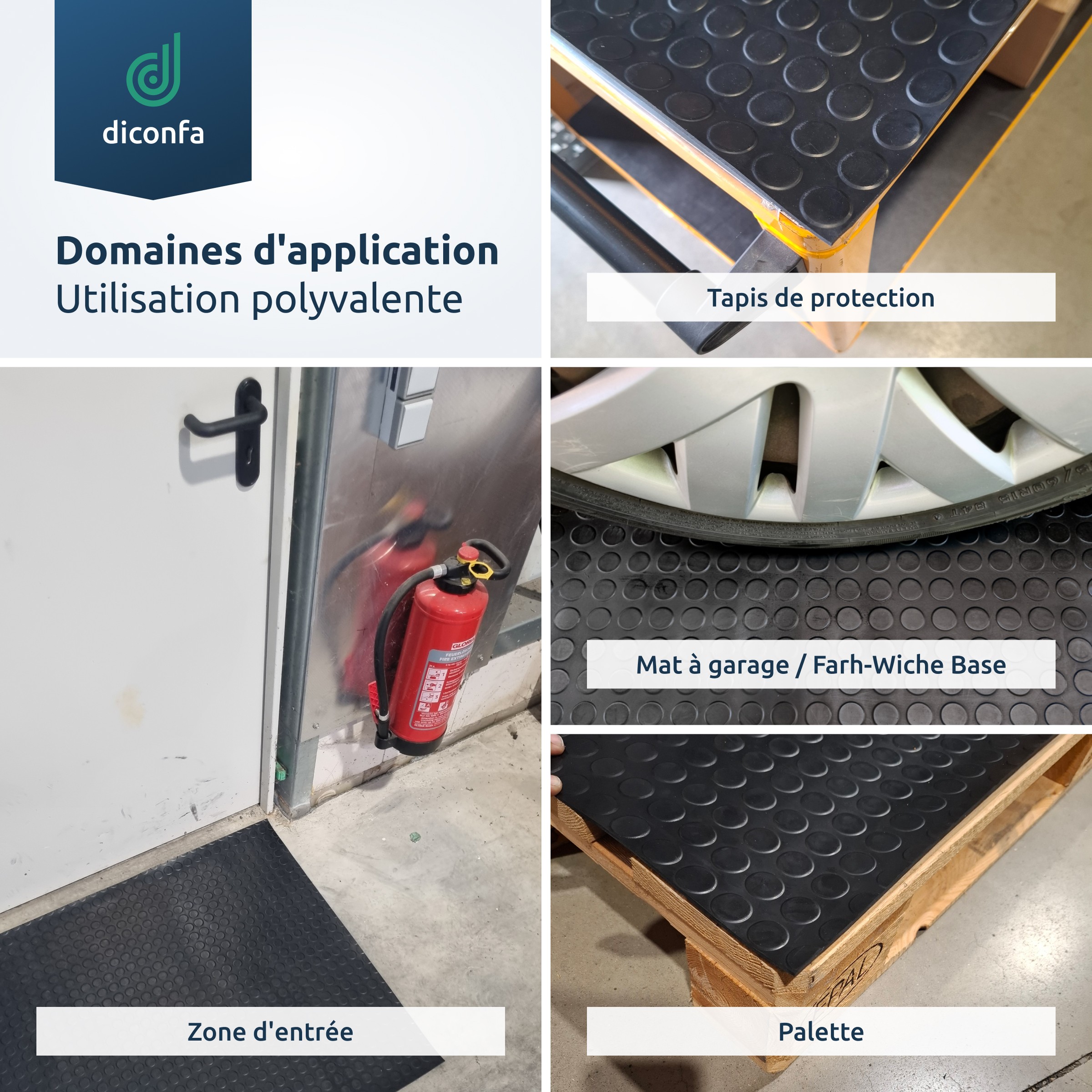DOMAINES D’APPLICATION : Le tapis en caoutchouc à pastilles plates est parfaitement adapté à une grande variété d’utilisations : industrie & logistique, artisanat & commerce, usage privé (p. ex. garage, écurie, atelier, jardin), plancher de remorque & revêtement de coffre, camping & tapis de tente, serres & élevage, étagères & établis, tapis de sol pour véhicules, bateaux & carports, tapis de protection de câbles & revêtement de poste de travail.