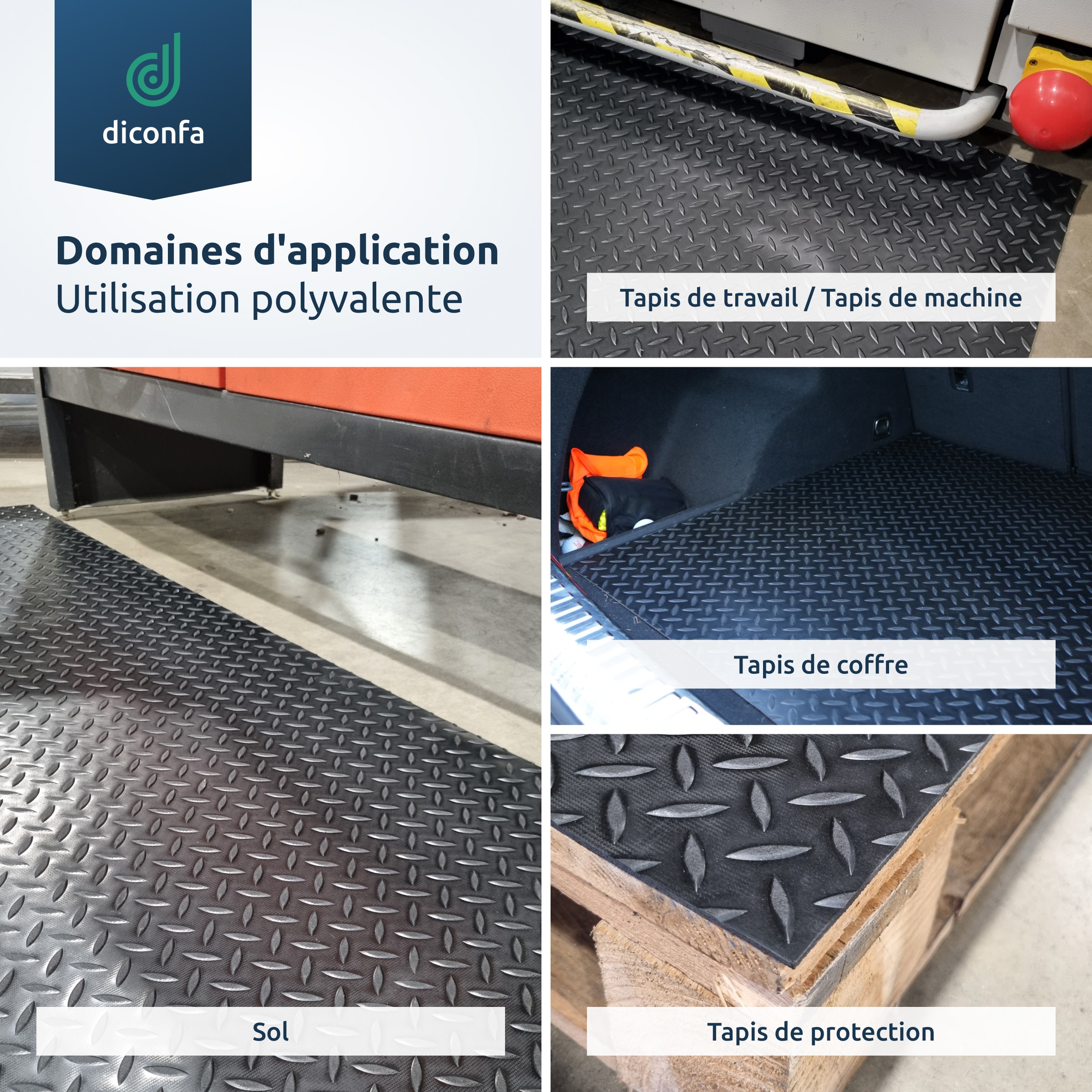 DOMAINES D’APPLICATION : Utilisable dans l’industrie, l’artisanat, la logistique ainsi qu’à titre privé. Convient pour les remorques, garages, camping, serres, étables, ateliers, établis, coffres de voiture ou bateaux comme revêtement d’étagère, paillasson, revêtement de sol en caoutchouc ou tapis de câbles.