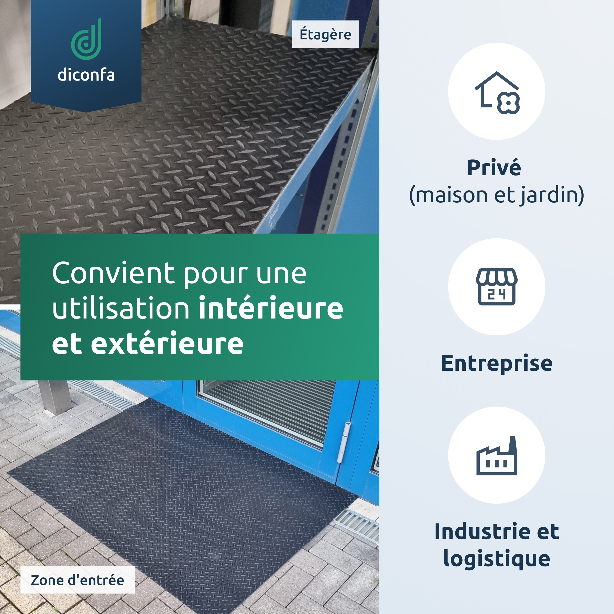 DIMENSIONS SUR MESURE : Le tapis en caoutchouc à motif diamant est épais de 3 mm et disponible en largeurs de 100 mm à 2.000 mm et en longueurs jusqu’à 10.000 mm.